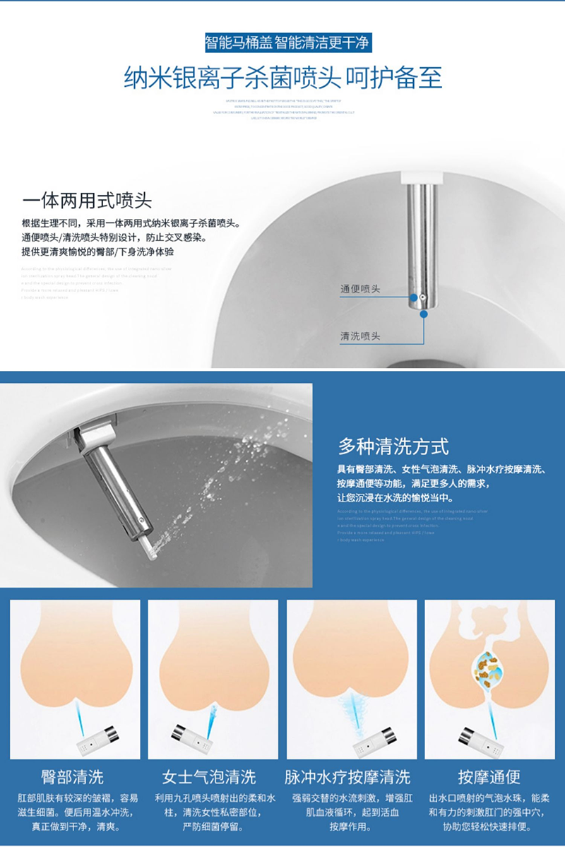 16、抗菌座圈和噴頭:座圈和噴頭均加入銀離子抗菌成分,不易滋生細(xì)菌;