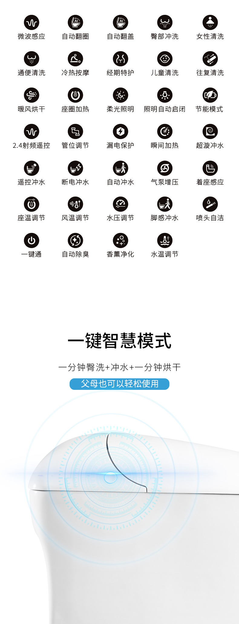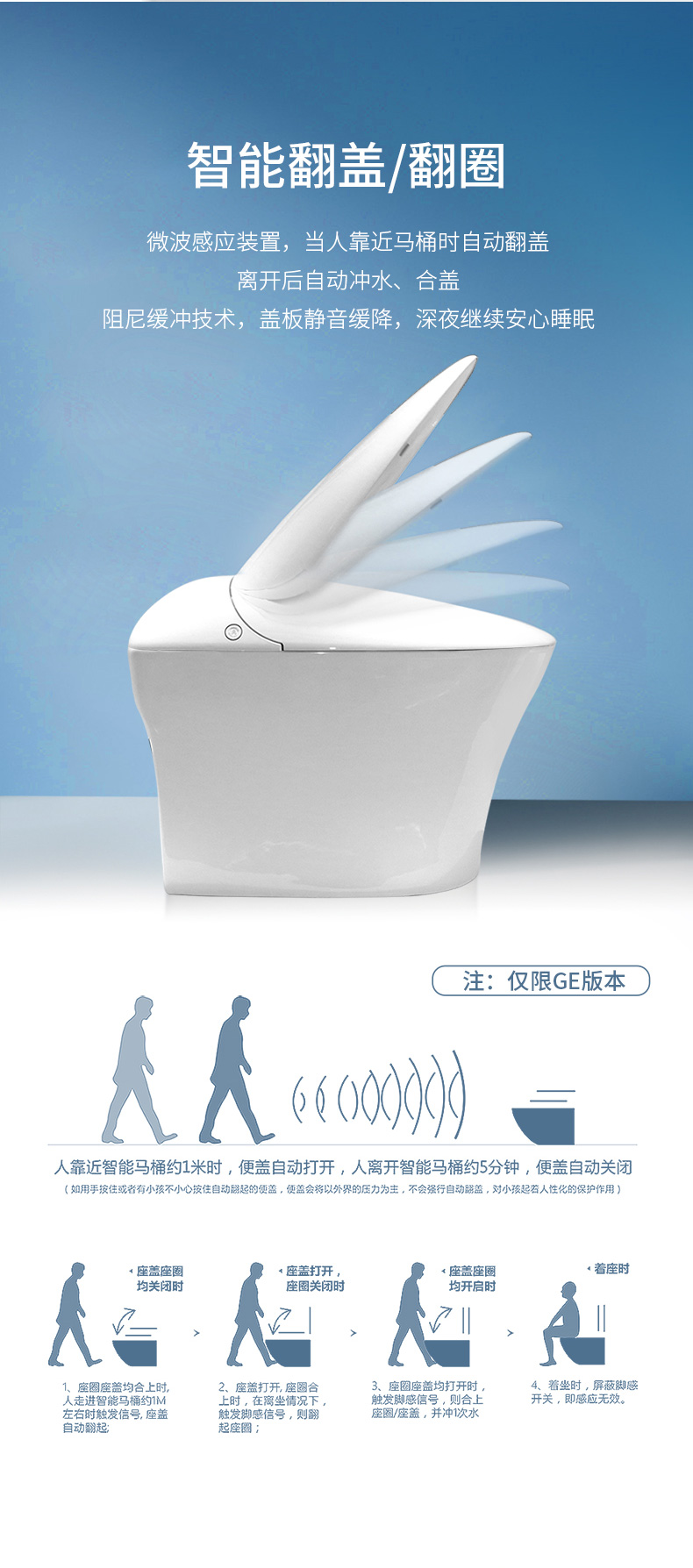 產(chǎn)品功能:1、微波感應、自動翻蓋/翻圈、